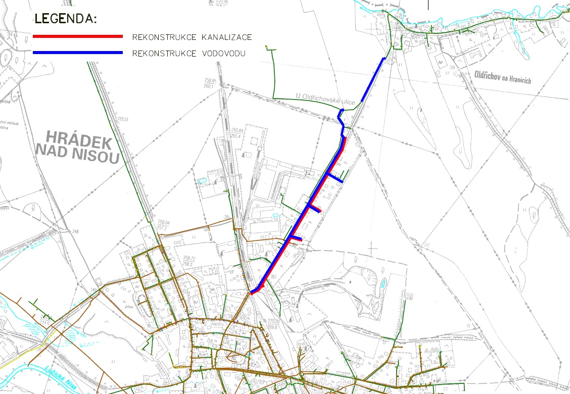 V rámci investiční akce SVS bude provedena rekonstrukce mezi křižovatkou ulic Oldřichovská, Husova, Větrná až po kruhovou křižovatku, a také v bočních větvích Oldřichovské ulice. S ohledem na kolizi kanalizace s plynovodem bude kanalizace vymístěna do nové trasy. Také vodovod bude vymístěn ze soukromých pozemků před průmyslovými areály. Pro rekonstrukci kanalizace bude použito kameninové potrubí vnitřního průměru 600 mm v délce 7 metrů, vnitřního průměru 500 mm v délce 322 metrů a vnitřního průměru 300 mm v celkové délce 527,5 metrů. Pro rekonstrukci vodovodu bude použito potrubí z vysokohustotního polyetylénu vnitřního průměru 150 mm v celkové délce 982 metrů, vnitřního průměru 100 mm v celkové délce 334 metrů a vnitřního průměru 80 mm v celkové délce 125,5 metrů. Součástí stavby je přepojení všech stávajících domovních vodovodních a kanalizačních přípojek, odbourání stávajících šachet do úrovně 1,5 m pod terénem, zrušení úseku stávající stoky v délce 342,5 metrů zalitím betonem a napojení rekonstruovaných úseků na navazující a odbočující řady/stoky. K výměně potrubí dojde převážně v otevřeném paženém výkopu a zčásti bezvýkopem (v soukromém pozemku). Závěrem dojde k obnově povrchů v rozsahu dotčeném stavbou.